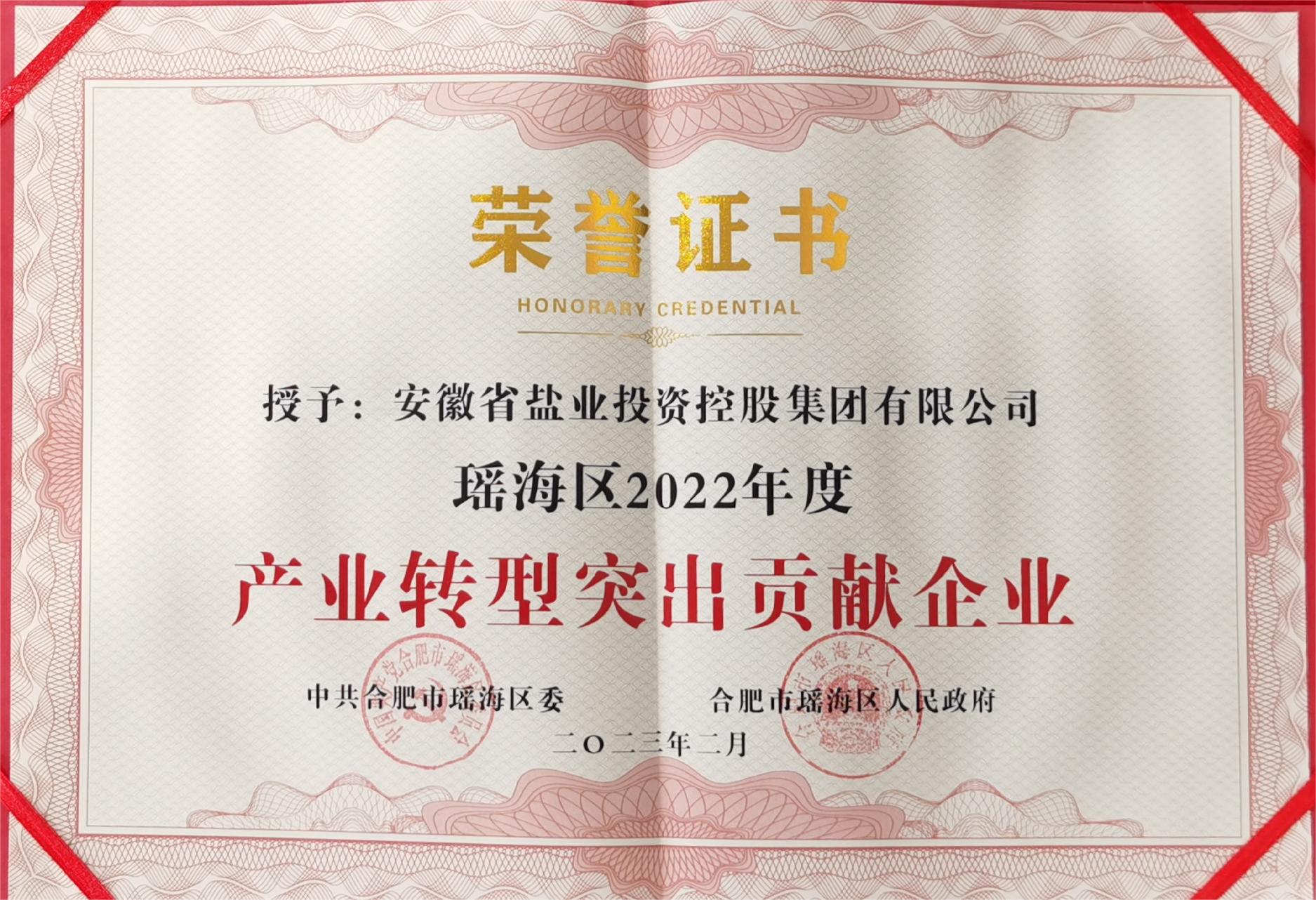 近日,省鹽業(yè)集團(tuán)獲得瑤海區(qū)委、區(qū)政府授予的瑤海區(qū)2022年度“產(chǎn)業(yè)轉(zhuǎn)型突出貢獻(xiàn)企業(yè)”榮譽稱號。