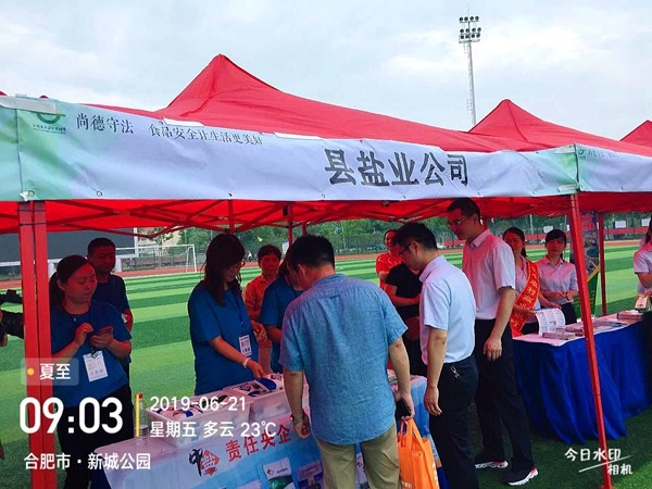 按照統(tǒng)一部署,6月21日早晨,長(zhǎng)豐縣鹽業(yè)公司5名工作人員早早就來到了活動(dòng)現(xiàn)場(chǎng),帶著《食鹽專營(yíng)辦法》等宣傳資料、品種鹽樣品及訂制的水杯參加宣傳活動(dòng)。啟動(dòng)儀式開始后,首先由縣政協(xié)副主席致辭;接著是合肥伊利乳業(yè)有限責(zé)任公司代表食品生產(chǎn)企業(yè)作承諾發(fā)言;最后由縣人大副主任宣布“長(zhǎng)豐縣2019年食品安全宣傳周暨食品安全長(zhǎng)豐行活動(dòng)正式啟動(dòng)”并會(huì)同場(chǎng)上領(lǐng)導(dǎo)共同按下儀式啟動(dòng)球?;顒?dòng)現(xiàn)場(chǎng)人群涌動(dòng),氣氛熱烈,長(zhǎng)豐公司5名工作人員穿著統(tǒng)一T恤,佩戴著工作證,分別在兩個(gè)展臺(tái)開展宣傳。主要宣傳《食鹽專營(yíng)辦法》、講解多品種鹽知識(shí),推崇“吃好鹽 選中鹽”,吃鹽首選“綠色食品鹽”的健康理念。