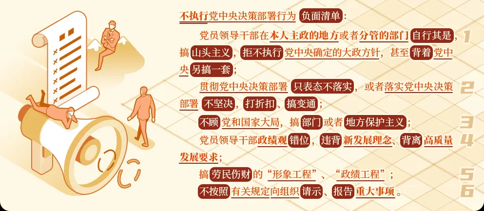 其中,前兩種行為嚴(yán)重程度不同:拒不執(zhí)行黨中央確定的大政方針行為危害更大,性質(zhì)更惡劣,一旦存在就要給予撤銷黨內(nèi)職務(wù)、留黨察看或者開除黨籍處分;貫徹黨中央決策部署只表態(tài)不落實(shí),或者落實(shí)黨中央決策部署不堅(jiān)決,打折扣、搞變通行為,在政治上造成不良影響或者嚴(yán)重后果的,視情節(jié)輕重給予警告直至開除黨籍處分。不顧黨和國家大局,搞部門或者地方保護(hù)主義的,同樣視情節(jié)輕重給予警告直至開除黨籍處分。