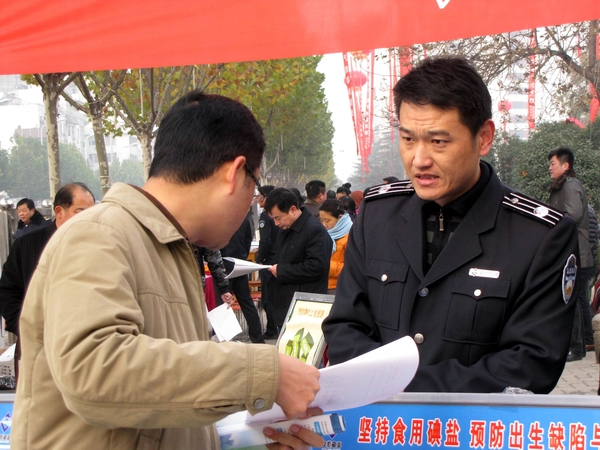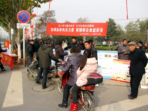 阜陽市鹽務(wù)局高度重視此次宣傳活動(dòng),結(jié)合自身業(yè)務(wù)范疇,精心準(zhǔn)備大量法制宣傳資料。早晨7時(shí),天氣陰冷,寒風(fēng)勁吹,我局鹽政執(zhí)法人員在副局長王道亞的帶領(lǐng)下,早早地布置好法制宣傳臺。在活動(dòng)現(xiàn)場王道亞親自向過往群眾宣傳鹽政法律法規(guī)知識,宣傳消費(fèi)者、經(jīng)營者的權(quán)利和義務(wù),宣傳消費(fèi)者如何依法維權(quán);進(jìn)行了假冒偽劣食鹽展示和鑒別;開展了涉鹽咨詢、受理投訴舉報(bào)。此次宣傳共發(fā)放宣傳資料500余份,接受群眾咨詢200余人次?;顒?dòng)現(xiàn)場布置了咨詢展臺,擺放宣傳圖板10塊、宣傳展架3個(gè)、懸掛 2條生動(dòng)主題橫幅,展示了近期查獲的部分劣質(zhì)私鹽樣品,教市民辨別真假碘鹽的活動(dòng),咨詢臺前觀看宣傳圖版和前來咨詢的群眾絡(luò)繹不絕,受到了親自趕赴現(xiàn)場慰問的市人大常委副主任李新才、市政府副市長黃珍、市政協(xié)副主席張永俠、市委宣傳部、市司法局和市依法治市領(lǐng)導(dǎo)小組辦公室有關(guān)領(lǐng)導(dǎo)以及廣大群眾的一致好評。