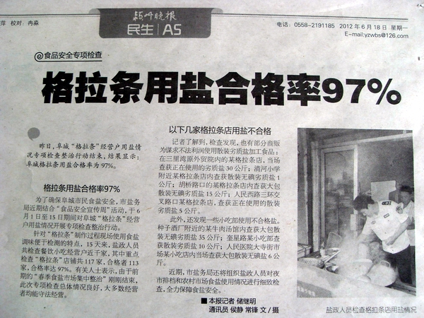 昨日,阜城“格拉條”經(jīng)營戶用鹽情況專項(xiàng)檢查整治行動結(jié)束,結(jié)果顯示:阜城格拉條用鹽合格率為97%。