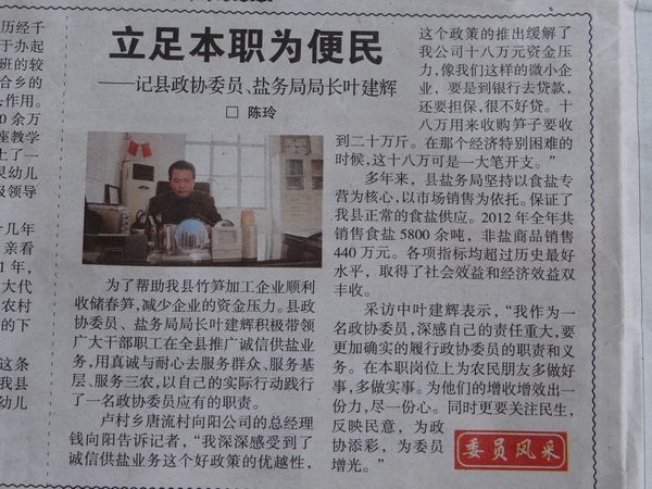 為了幫助我縣竹筍加工企業(yè)順利收儲春筍,減少企業(yè)的資金壓力??h政協(xié)委員、鹽務(wù)局局長葉建輝積極帶領(lǐng)廣大干部職工在全縣推廣誠信供鹽業(yè)務(wù),用真誠與耐心去服務(wù)群眾、服務(wù)基層、服務(wù)三農(nóng),以自己的實際行動踐行了一名政協(xié)委員應(yīng)有的職責(zé)。