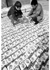 今年5月起,蒙城縣鹽務局鹽政稽查大隊和公安部門聯(lián)手,歷時5個多月,破獲一起加工銷售假冒綠色食品鹽的團伙案,抓獲違法犯罪嫌疑人12人,案件涉及假冒綠色食品鹽600余噸。該案涉及皖蘇豫三省以及蒙城、亳州等六縣(市),時間跨度達6年之久。圖為11月6日,蒙城縣鹽政執(zhí)法人員在查看清點收繳的私鹽。