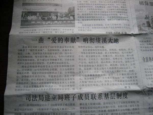 縣鹽業(yè)公司職工胡亞宏于2007年經(jīng)南京軍區(qū)醫(yī)院診斷患了“慢性腎衰竭”,為控制病情,走遍北京、南京、上海、蕪湖等各大醫(yī)院掛專家門診,這幾年一直用藥物控制,每年醫(yī)療費2萬余元;今年3月胡亞宏病情惡化,醫(yī)生建議需作腎移植手術(shù),目前在福州軍區(qū)總醫(yī)院進行腎配型,手術(shù)費用大約40余萬元。