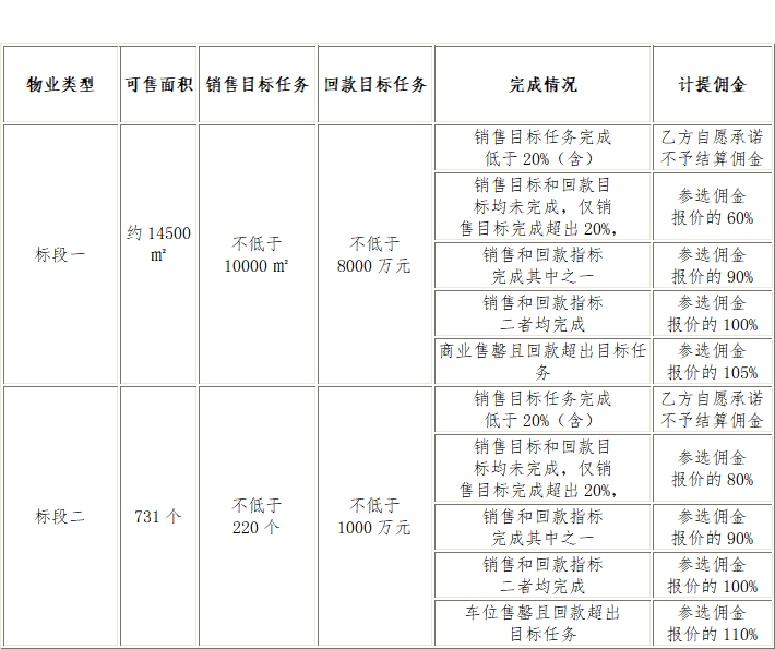 七、投標(biāo)限價:本次比選文件中標(biāo)段一和標(biāo)段二所涉及的業(yè)態(tài)在合作期限、銷售完成目標(biāo)、回款目標(biāo)、分銷團(tuán)隊人員配備、傭金計提點(diǎn)數(shù)、以及履約保證金等設(shè)定了最低報價指標(biāo),低于此指標(biāo)的按廢標(biāo)處理。