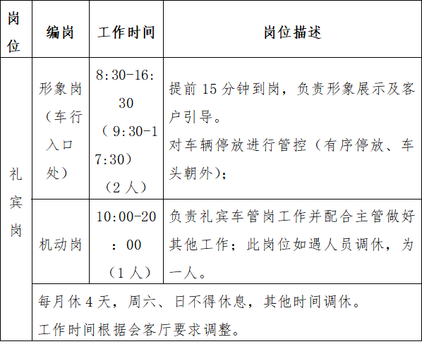 2、鑒于人員配置較為緊張,在調(diào)休方面按照整體進(jìn)行調(diào)配保證高效服務(wù)和良好的機(jī)動(dòng)性。