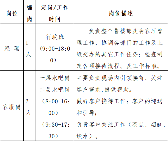 會(huì)客廳經(jīng)理1名、水吧服務(wù)員2名、禮賓員3名、保潔員2名。