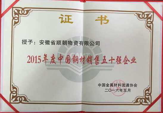 2016年5月27日,第三屆中國鋼鐵產(chǎn)業(yè)企業(yè)家峰會在山東省濱州市隆重開幕,本次峰會由中國金屬材料流通協(xié)會和濱州市博興縣人民政府聯(lián)合主辦,來自中國鋼鐵工業(yè)協(xié)會、中國施工企業(yè)管理協(xié)會、中國汽車工業(yè)協(xié)會等上下游行業(yè)協(xié)會領(lǐng)導(dǎo)、鋼鐵生產(chǎn)、流通、終端用戶等全產(chǎn)業(yè)鏈企業(yè)家近500人出席。會上,安徽順朝第三次蟬聯(lián)中國金屬材料流通協(xié)會授予的“中國鋼材銷售五十強(qiáng)企業(yè)”稱號。