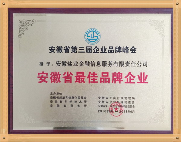 2016年6月18日,由安徽省經(jīng)濟(jì)和信息化委員會(huì)、安徽省科學(xué)技術(shù)廳、安徽省商務(wù)廳、安徽省工商行政管理局、安徽省企業(yè)品牌促進(jìn)會(huì),共同舉辦的“安徽省笫三屆企業(yè)品牌峰會(huì)”在省人大會(huì)議中心舉行。安徽鹽業(yè)金融信息服務(wù)有限責(zé)任公司(簡(jiǎn)稱徽鹽金融)榮獲“安徽省最佳品牌企業(yè)”獎(jiǎng)項(xiàng)并受邀參加本次會(huì)議。