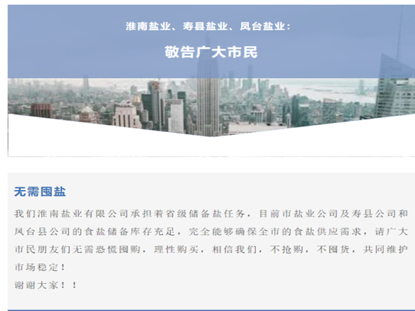 為有效阻止食鹽搶購(gòu)風(fēng)波蔓延,全省各級(jí)鹽業(yè)公司一方面充分利用微信公眾號(hào)、地方性媒體、微信朋友圈等線上渠道發(fā)布正面宣傳信息,另一方面積極組織人員進(jìn)商超、下市場(chǎng),通過(guò)面對(duì)面的宣傳形式,引導(dǎo)廣大消費(fèi)者不搶購(gòu)、不囤貨、理性購(gòu)鹽。