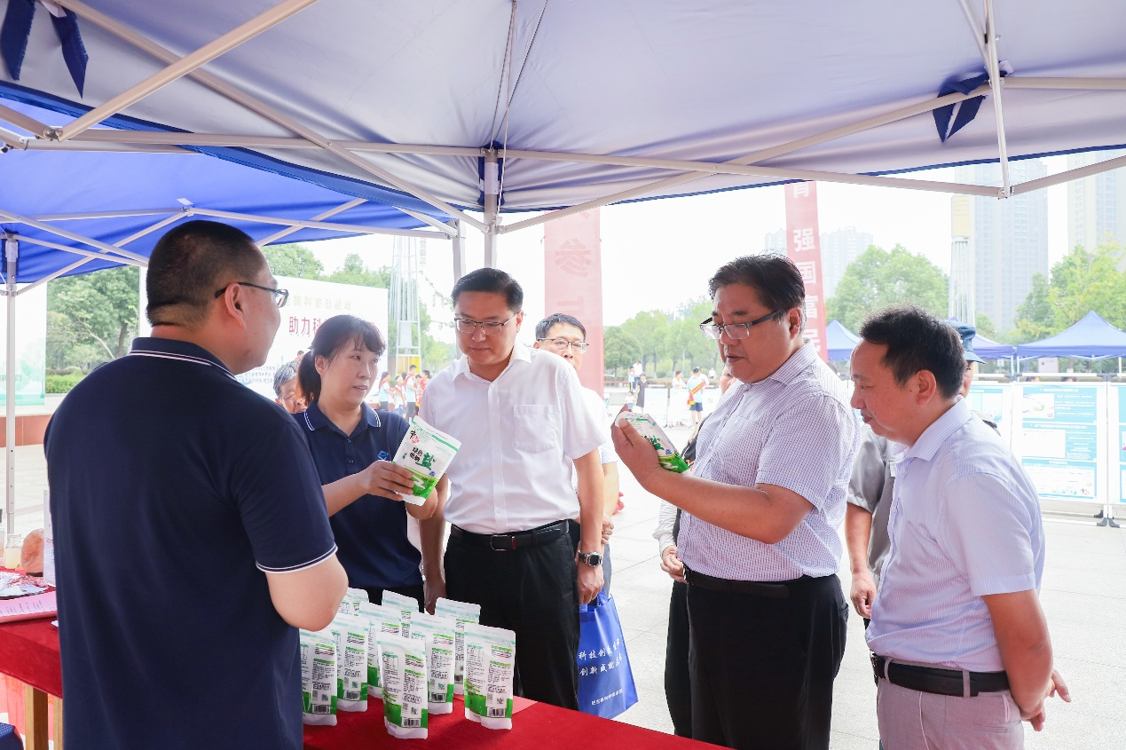 活動(dòng)中,肥東縣委副書(shū)記陳濤等領(lǐng)導(dǎo)來(lái)到展臺(tái)前,聽(tīng)取中鹽綠色低鈉鹽介紹。