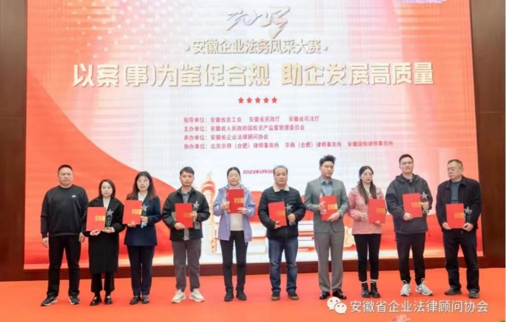 2023年11月15日上午,由安徽省總工會、安徽省民政廳、安徽省司法廳指導(dǎo),安徽省人民政府國有資產(chǎn)監(jiān)督管理委員會主辦,安徽省企業(yè)法律顧問協(xié)會承辦的“2023年安徽企業(yè)法務(wù)風采大賽”在合肥成功舉辦。本次大賽主題是“以案(事)為鑒促合規(guī),助企發(fā)展高質(zhì)量”,共征集征文、PPT、微視頻等法治作品155篇(部)。