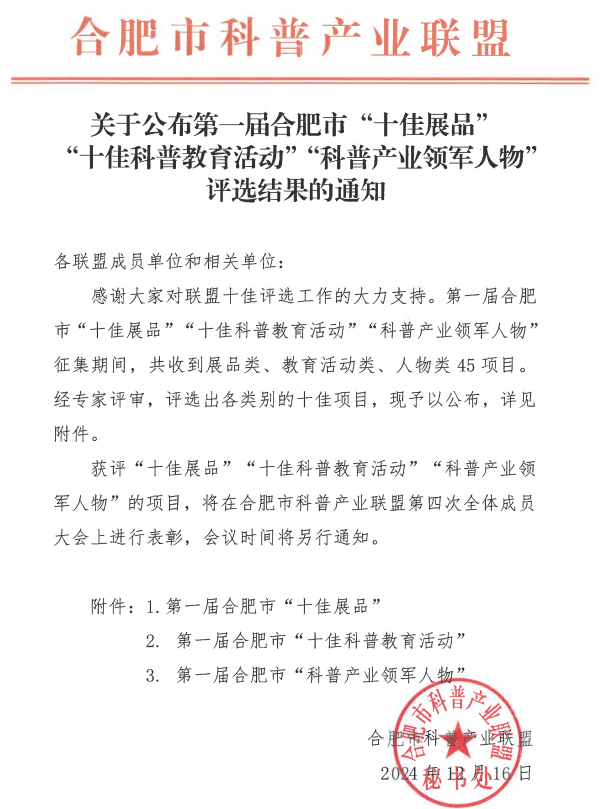 近日,由合肥市科普產(chǎn)業(yè)聯(lián)盟舉辦的第一屆合肥市“十佳展品”“十佳科普教育活動”“科普產(chǎn)業(yè)領軍人物”評選結(jié)果公布,合肥鹽業(yè)“鹽”學之旅——食鹽科普研學活動榮膺第一屆合肥市“十佳科普教育活動”。