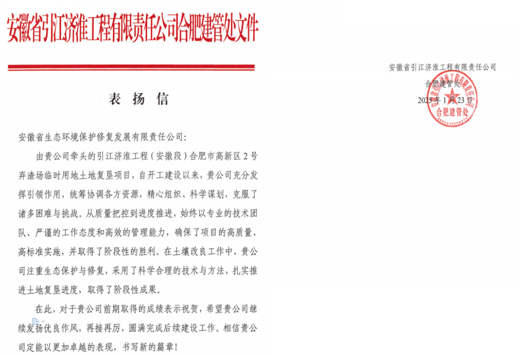 新年的第一封表揚(yáng)信帶著溫暖而至,1月23日,安徽省引江濟(jì)淮工程有限責(zé)任公司合肥建管處致表揚(yáng)信,信中對(duì)生態(tài)修復(fù)公司牽頭的引江濟(jì)淮工程(安徽段)合肥市高新區(qū)2號(hào)棄渣場臨時(shí)用地土地復(fù)墾項(xiàng)目的建設(shè)質(zhì)量、進(jìn)度推進(jìn)以及土壤改良等方面的工作給予充分肯定,對(duì)項(xiàng)目部同事的專業(yè)素養(yǎng)和工作作風(fēng)給予高度贊揚(yáng)。