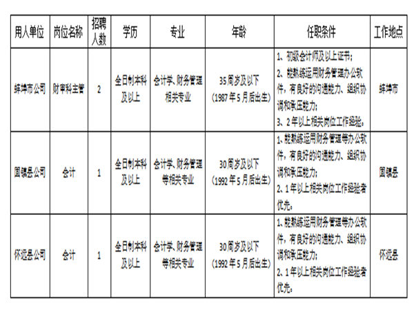 2、縣公司會計:男女不限,全日制本科及以上學歷,年齡30周歲及以下,會計學、財務管理等相關(guān)專業(yè);1年以上相關(guān)崗位工作經(jīng)驗者優(yōu)先。