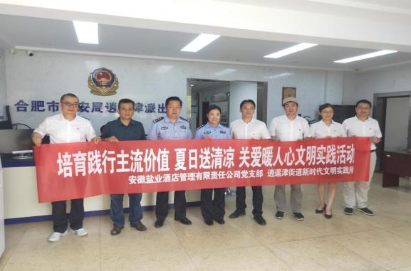 炎炎高溫送清涼,親切慰問暖警心,一聲親切的問候,一瓶清涼的礦泉水,表達著對一線勞動者的敬意。8月10日下午,酒店管理公司黨支部的黨員志愿者們,在逍遙津街道文明辦鐘主任的陪同下,來到合肥市廬陽區(qū)逍遙津派出所,看望慰問辛勤堅守在第一線的基層民警們,并為他們送去礦泉水、防暑降溫包等慰問品,感謝他們在維護轄區(qū)治安秩序和諧穩(wěn)定等方面做出的突出貢獻。