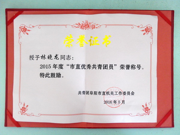 日前,阜陽市鹽務(wù)局鹽政科稽查隊(duì)員林曉龍被共青團(tuán)阜陽市委授予“2015年度市直優(yōu)秀共青團(tuán)員”榮譽(yù)稱號。