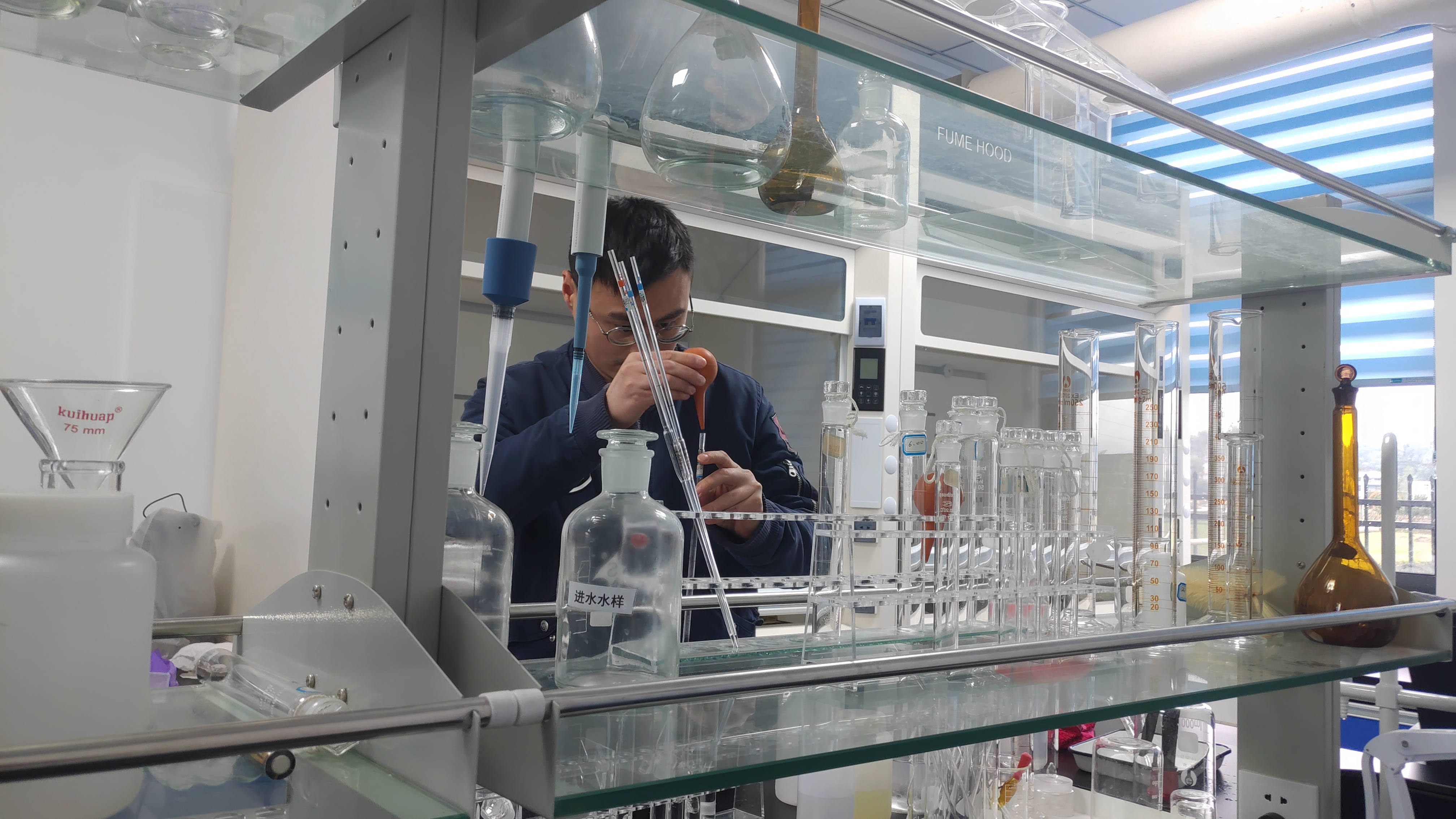 (上圖為檢測(cè)員正在對(duì)污水處理廠進(jìn)水水質(zhì)進(jìn)行檢測(cè))