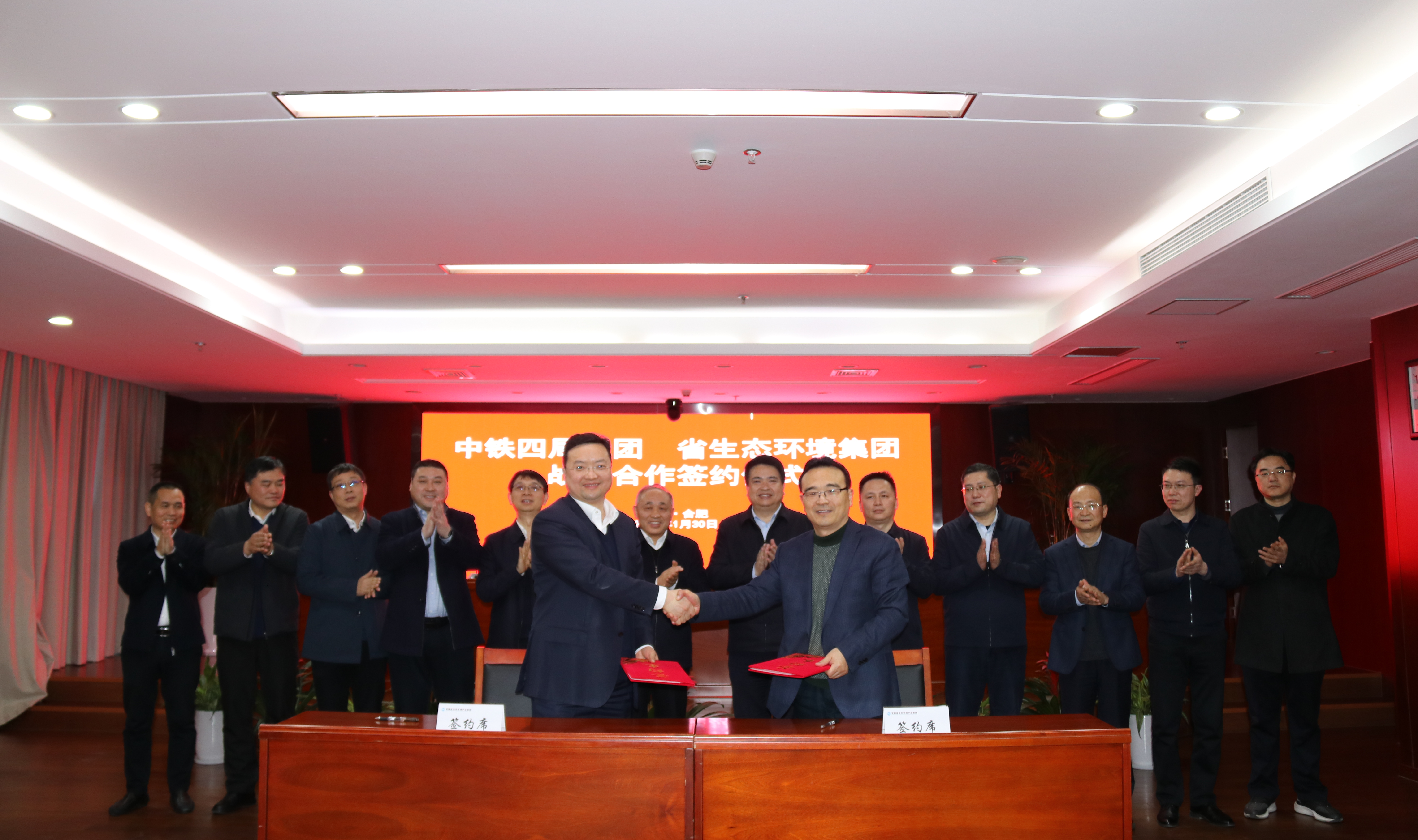 省生態(tài)環(huán)境集團(tuán)黨委委員、副總經(jīng)理王奇,中鐵四局集團(tuán)黨委常委、副總經(jīng)理?xiàng)钶x代表雙方簽訂戰(zhàn)略合作協(xié)議。省生態(tài)環(huán)境集團(tuán)黨委委員、紀(jì)委書(shū)記繆磊及雙方有關(guān)單位負(fù)責(zé)同志參加會(huì)議。