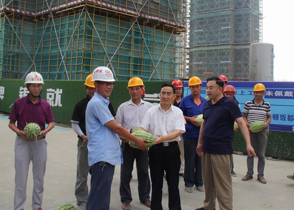 王思軍頂著烈日、冒著酷暑來到六安項(xiàng)目在建工地,與施工人員親切交談,詳細(xì)了解防暑降溫工作保障情況,將綠豆、西瓜、毛巾、清涼油等防暑降溫物品送到一線職工手中,希望各參建單位通力合作,全力實(shí)現(xiàn)人員安全、施工安全和質(zhì)量安全。