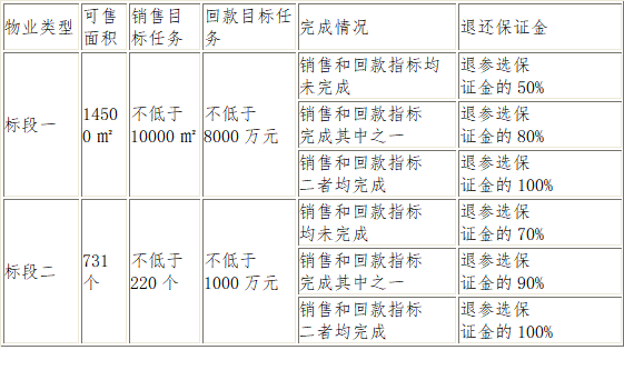 七、投標(biāo)限價:本次比選文件中標(biāo)段一和標(biāo)段二所涉及的業(yè)態(tài)在合作期限、銷售完成目標(biāo)、回款目標(biāo)、分銷團(tuán)隊人員配備、傭金計提點(diǎn)數(shù)、以及履約保證金等設(shè)定了最低報價指標(biāo),低于此指標(biāo)的按廢標(biāo)處理。