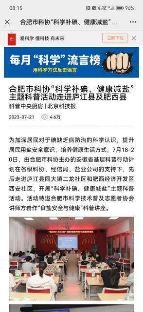 如何科學補碘?怎樣科學食用鹽?為提升居民用鹽安全意識,培養(yǎng)健康生活方式,7月下旬,由合肥市科協(xié)主辦的“惠民興村、共創(chuàng)名城”安徽省基層科普行動計劃先后走進廬江縣同大鎮(zhèn)二龍社區(qū)、肥西縣經(jīng)濟開發(fā)區(qū)西安社區(qū)、巢湖市伍賈社區(qū),開展“科學補碘、健康減鹽”主題科普活動。