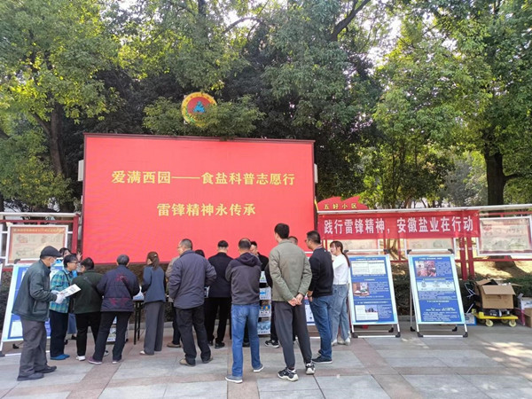 活動現(xiàn)場,通過擺放宣傳展架、低鈉鹽、生活用鹽展臺、懸掛“踐行雷鋒精神,安徽鹽業(yè)在行動”橫幅、大屏幕投放主題標語等,營造了濃厚的活動氛圍。志愿服務(wù)隊向社區(qū)居民免費發(fā)放宣傳單頁、控鹽量勺、綠色低鈉鹽等物品,為居民如何健康用鹽答疑解惑,宣傳科學補碘知識,倡導(dǎo)低鈉飲食消費理念,贏得了社區(qū)居民廣泛好評。