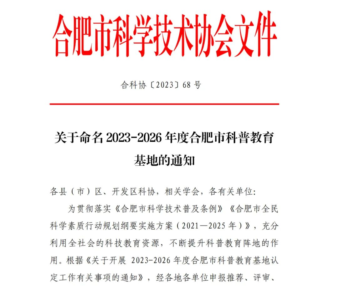 9月21日,合肥市科學技術協(xié)會經各地各單位申報推薦、評審、驗收、公示等程序,正式發(fā)文公布命名合肥鹽業(yè)等126家場館為“2023-2026年度合肥市科普教育基地”。