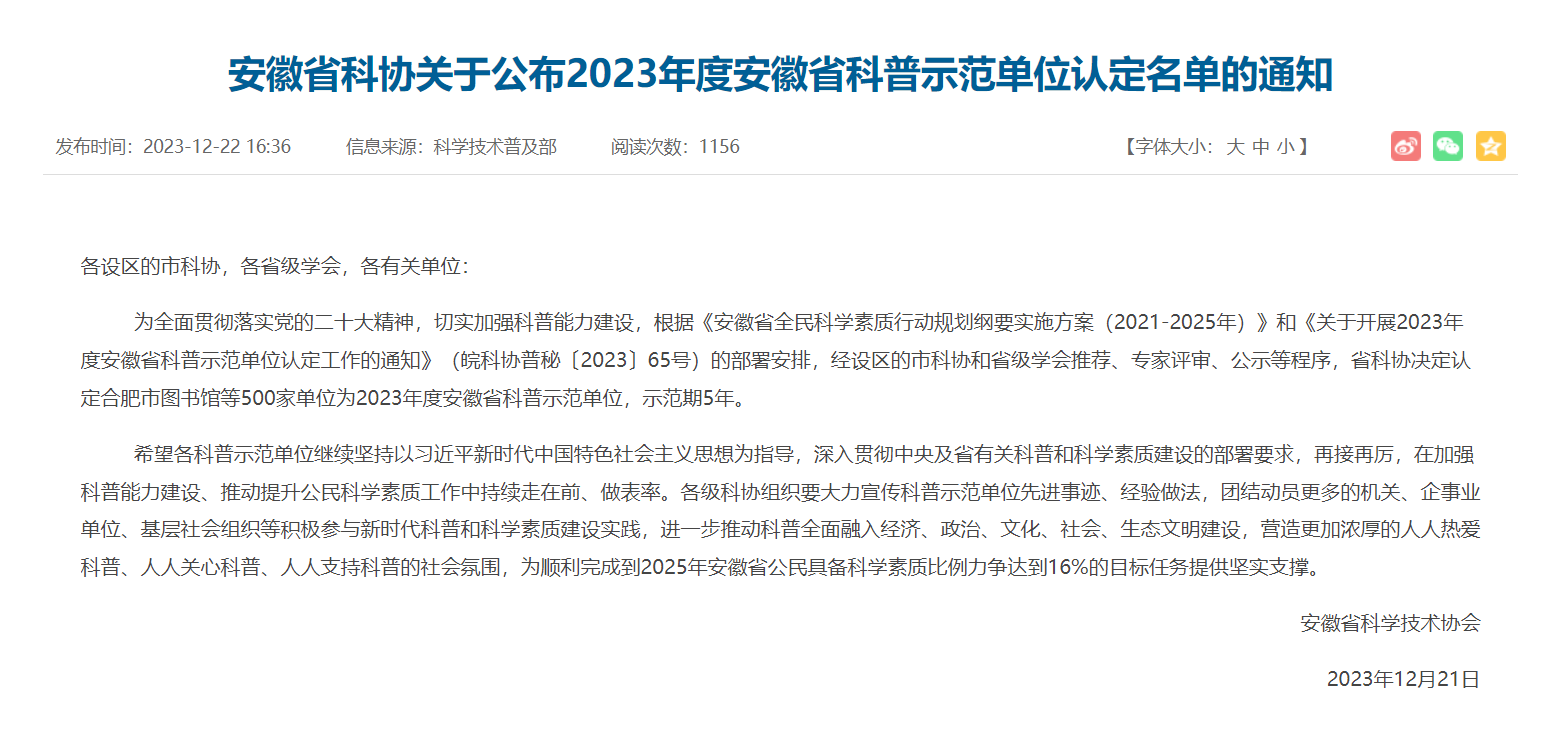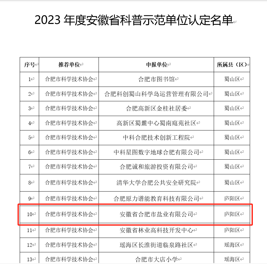 為全面貫徹落實(shí)黨的二十大精神,切實(shí)加強(qiáng)科普能力建設(shè),根據(jù)《安徽省全民科學(xué)素質(zhì)行動規(guī)劃綱要實(shí)施方案(2021-2025年)》和《關(guān)于開展2023年度安徽省科普示范單位認(rèn)定工作的通知》(皖科協(xié)普秘〔2023〕65號)的部署安排,經(jīng)設(shè)區(qū)的市科協(xié)和省級學(xué)會推薦、專家評審、公示等程序,安徽省科協(xié)決定認(rèn)定安徽省合肥市鹽業(yè)有限公司為2023年度安徽省科普示范單位,示范期5年。