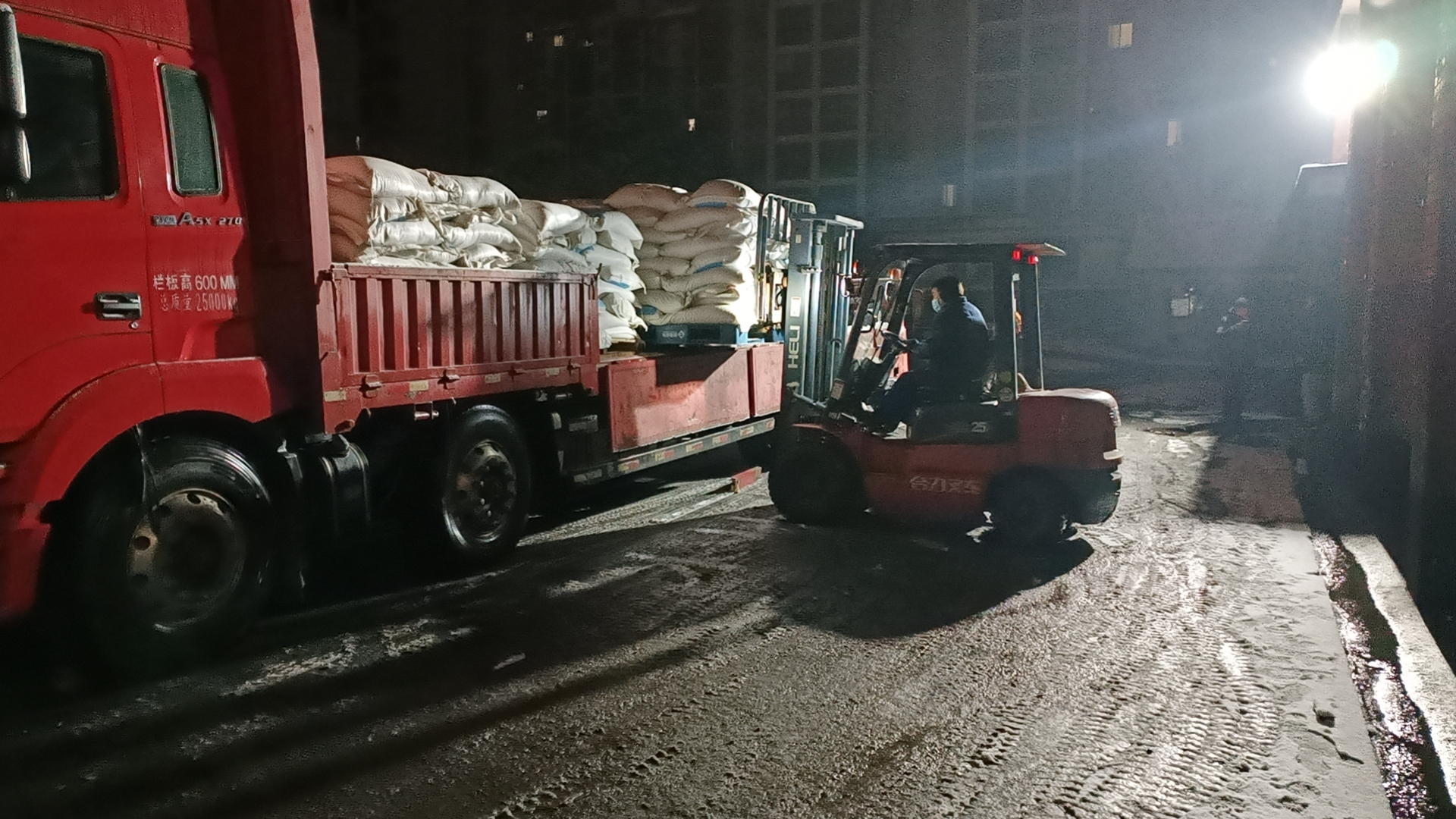 公司領(lǐng)導(dǎo)班子親赴倉儲(chǔ)配送一線指揮調(diào)度,全市一市五縣鹽業(yè)干部職工眾志成城抗冰雪,頂著風(fēng)雪嚴(yán)寒,冒著雨雪和刺骨的寒風(fēng)奮戰(zhàn)在保供一線。截至2月4日下午,合肥鹽業(yè)共出動(dòng)配送車輛200臺(tái)次、配送人員100余人次、累計(jì)發(fā)出融雪鹽1500余噸,為清除全市各大公共交通道路積雪提供了有力保障。同時(shí),將倉庫內(nèi)過期及破損小包裝鹽品拆袋裝換,為此次保供任務(wù)轉(zhuǎn)化融雪鹽品近20噸。4日晚上11點(diǎn)臨時(shí)接到市政部門緊急用鹽,公司搬運(yùn)人員在已連續(xù)作戰(zhàn)48小時(shí)的情況下,仍第一時(shí)間從家中趕至公司,奮戰(zhàn)在融雪鹽保供一線。